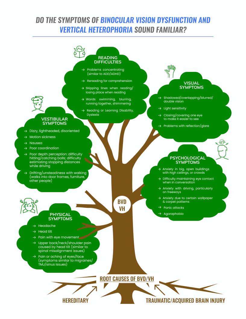 It’s common for people to have been diagnosed with a myriad of other conditions, and then find out that Binocular Vision Dysfunction was the true culprit. These other conditions include: